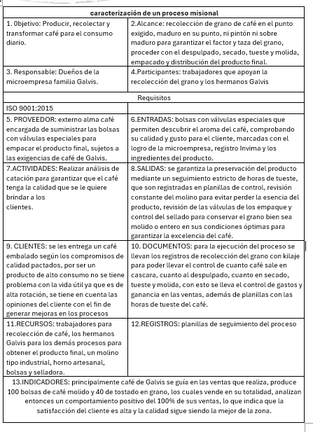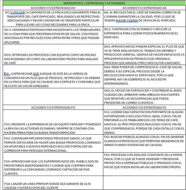 Recursos humanos: en esta actividad es importante estar a la vanguardia en la catación de café ya que es la forma de identificar los tipos de café que se están elaborando, por ello los hijos de los que hacen parte de la micro empresa están en cursos cada vez que se tiene la oportunidad teniendo en cuenta que se busca que la tradición de café de Galvis continue por las siguientes generaciones.